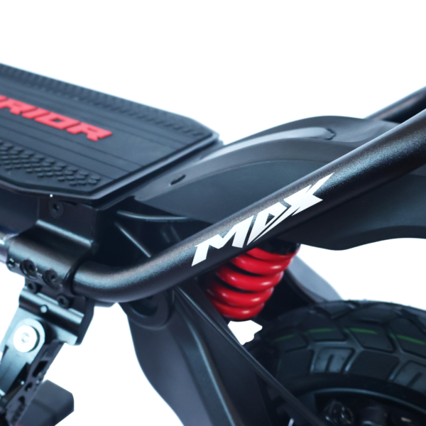 The Warrior X Max is equipped with a motorcycle-style inverted hydraulic front fork (79 mm travel) and an adjustable rear hydraulic spring shock, delivering smooth performance on bumps, cobblestones, gravel, and uneven terrain.